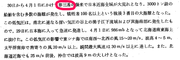 春三番があるなら春二番、春一番も当然あったわけで、春二番は3月24日が該当しそうです。また、この年の関東地方における春一番は3月20日に観測されました。これは観測史上もっとも遅い春一番でしたが、この春一番をもたらした低気圧によって富士山では死亡・不明24人という史上最大(当時1)のパンパカ遭難が発生しました。さらに、九州西方の男女群島付近でも死亡・不明13人という漁船の座礁事故が起きています。